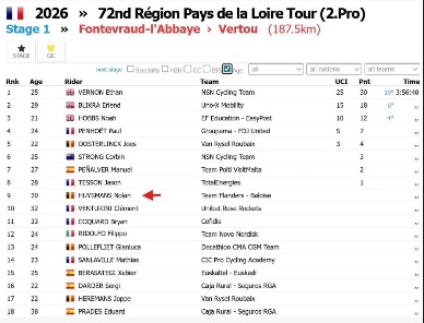 De Brit Ethan Vernon won de openingsrit van de 72ste Région Pays de la Loire Tour, een meerdaagse van de Pro Series, voor de Noor Erlend Blikra en zijn landgenoot Noah Hobbs. Neoprof Nolan Huysmans (20) finishte knap negende in Vertou. Rassprinters als een Bryan Coquard (11de) en Sam Bennett (27ste) hield Huysmans achter zich. Woensdag dient er zich na een rit tussen La Garnache en Les Sables d'Olonne een nieuwe sprintkans aan voor de snelle Vlaams-Brabander.